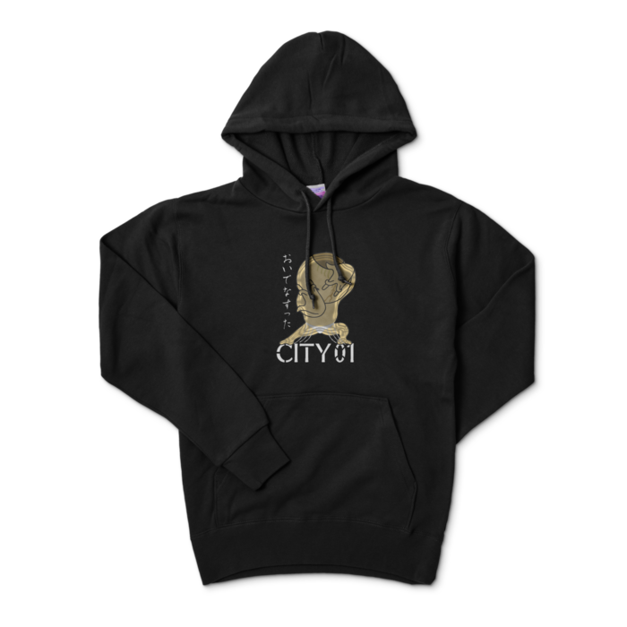 キモンくんが印を結び、いわゆるダブルエンガッチョを顔に這わせたパーカーの黒になります。